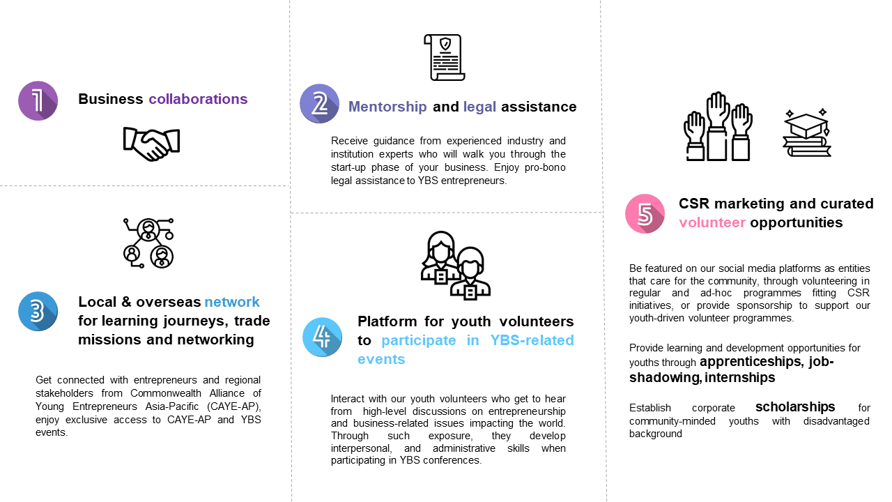 As a central node for start-ups and entrepreneurs, YBS seeks to support youth entrepreneurs in their start-up and scaling phase, youth running SMEs, and youth running their family-owned-businesses, by facilitating in these 5 key areas: